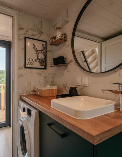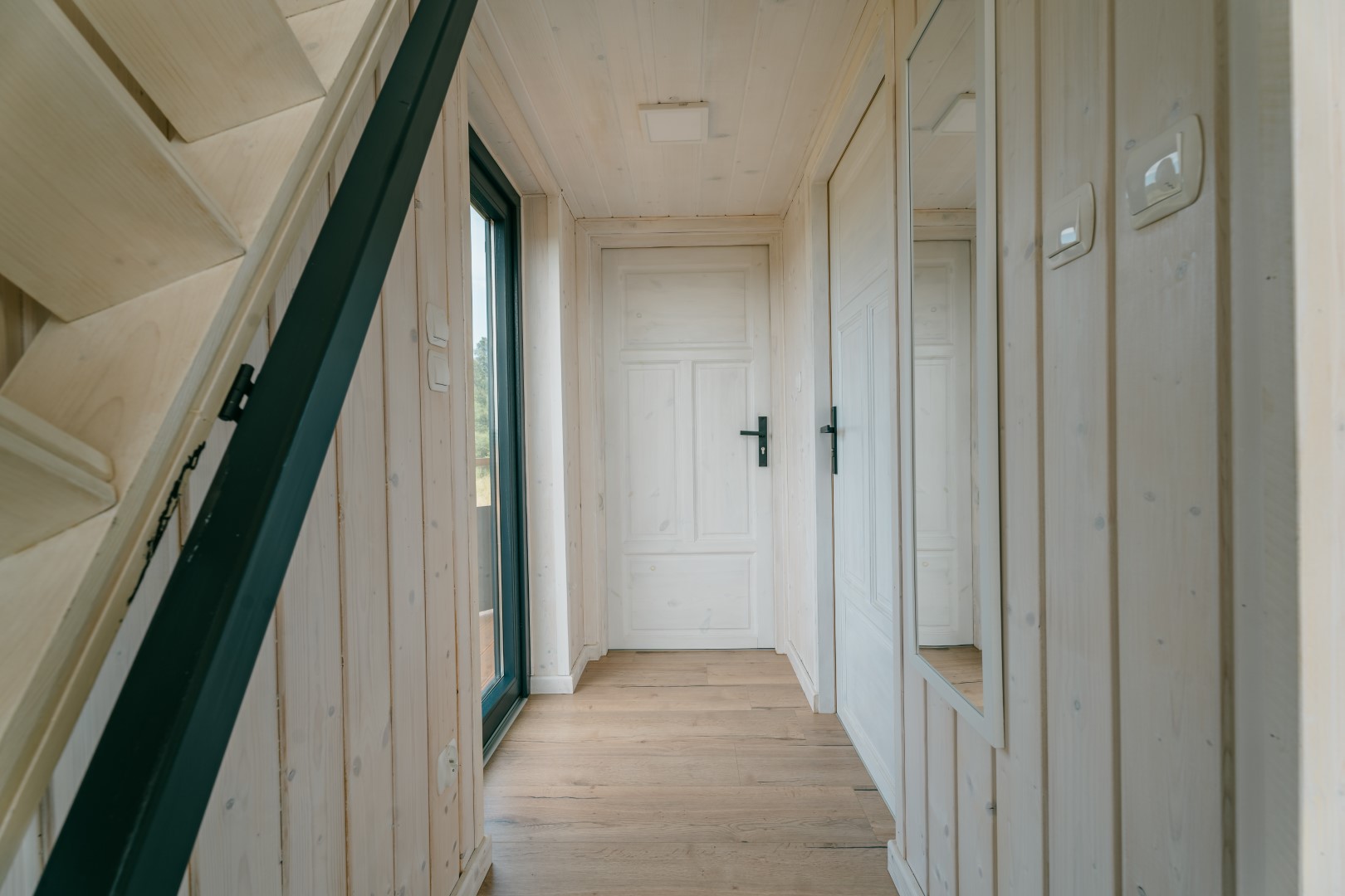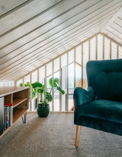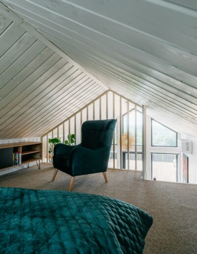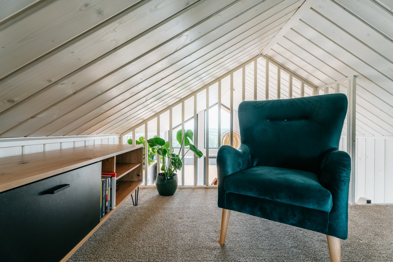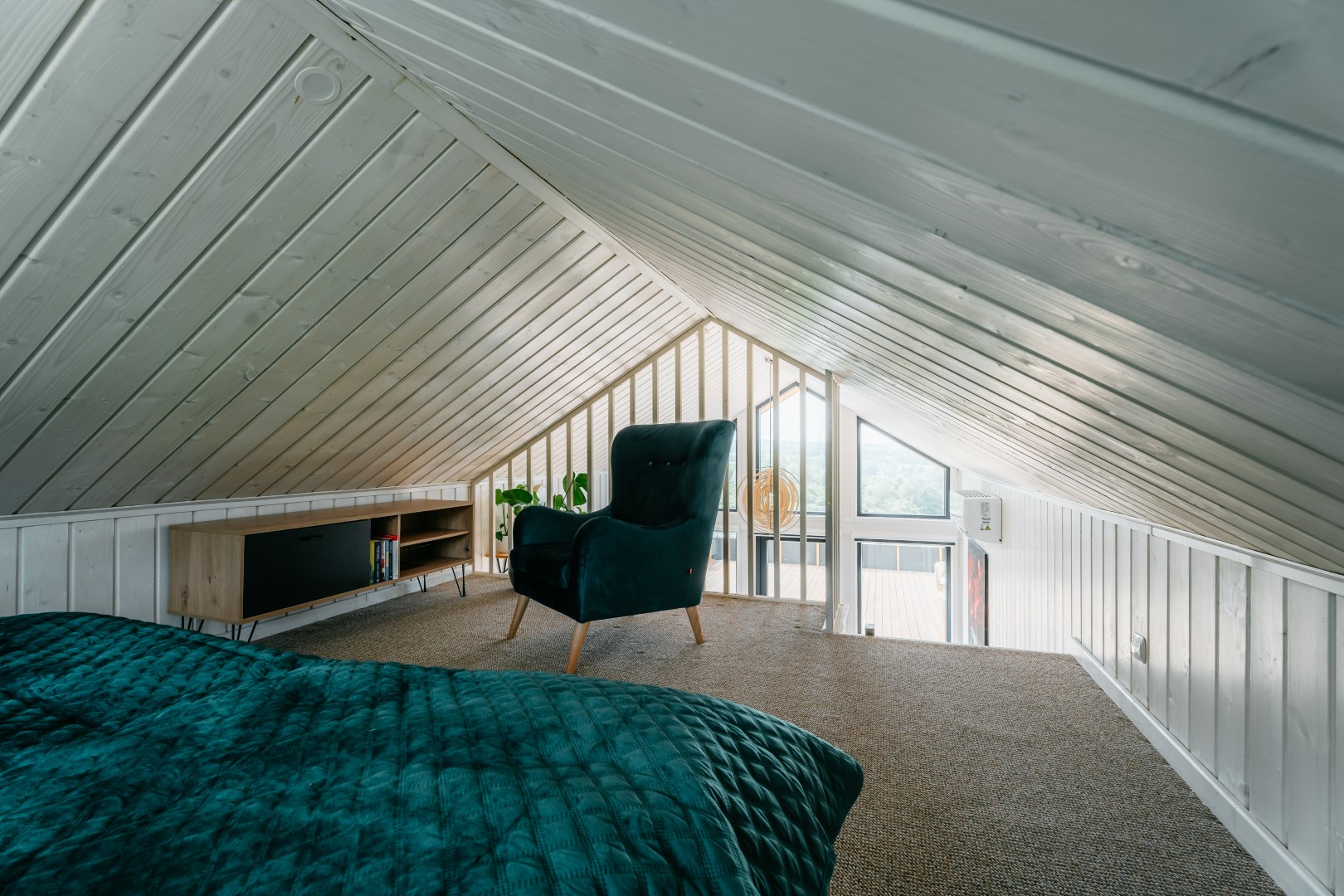 Antresola nie jest wysoka (1,65m w szczycie) ale wygonie prześpią się tam 2 osoby, można poczytać tutaj książę na wygodnym fotelu lub nacieszyć oczy krajobrazem wyłaniającym się zza okna.