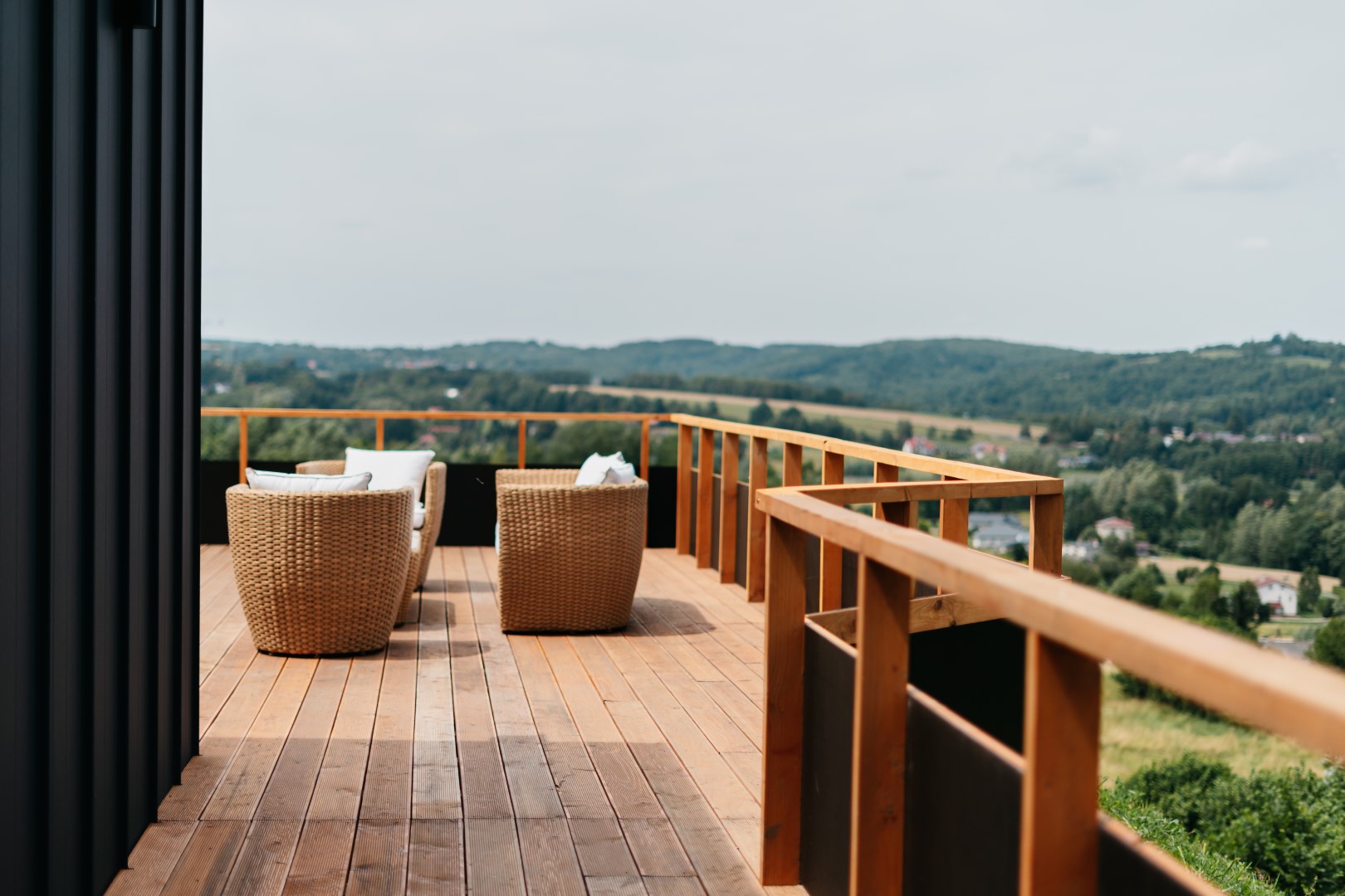 Tylny taras z wyjściem od strony dolnej sypialni jest bardziej kameralny, idealny na nieśpieszną kawę o poranku.
